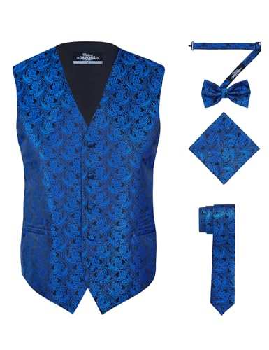 S.H. Churchill & Co. Men's 4 Piece Paisley Vest Set, with Bow Tie, Neck Tie & Pocket Hanky - 4XL, Royal Blue/Black