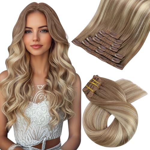 Moresoo Clip in Hair Extensions Real Human Hair Brown to Blonde Hair Extensions Clip ins Light Brown to Meidum Blonde Balayage Soft And Straight 120g/7pcs 16 inch