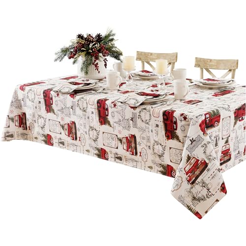 Newbridge Christmas Pine Hill Tree Farm 60 x 102 Inch Rectangle Fabric Tablecloth, Nostalgic Retro Holiday Country Farm Truck No Iron and Stain Resistant Table Cover for Party, Banquet and Buffet