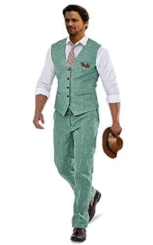 Feature:Linen suit for men,casual business suit with slim-fitting cut;Vest:5 Button,V-Neck,Smooth Back And Adjustable Back Tie;Pants:Flat Front,Zippered Fly,Button End and Waist is Adjustable.