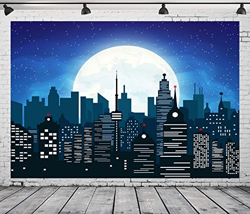 CORFOTO 7x5FT Cartoon Super City Backdrop for Super City Themed Party Supplies Skyline City Background Kids Boys Birthday Banner Urban Night Moon City Buildings Backdrops Super Photo Props