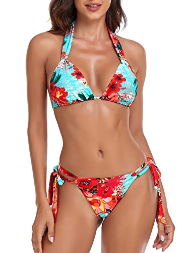 RELLECIGA Women Triangle Bikini Set Push up High Cut Thong 2 Piece Swimsuit Blue Floral Small