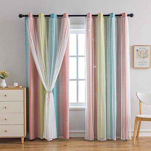 conokata Star Girl and Kids Curtains for Bedroom Rainbow Ombre Double Layer Cute Shot Nursery Darkening Grommet Princess Room Décor 2 Panels Living Room Window Curtain (Blue Pink 52W x 84L)