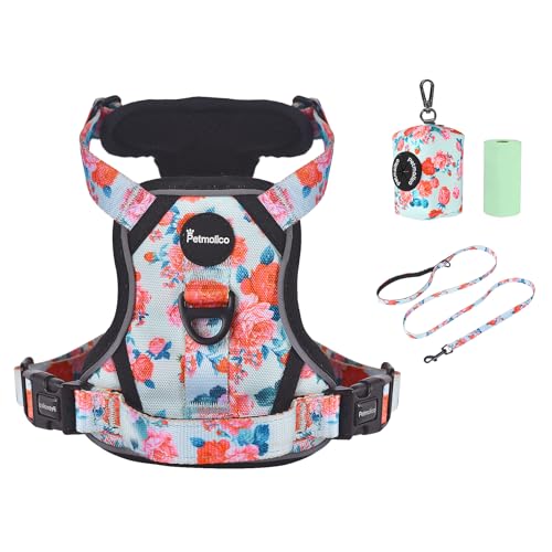 Petmolico No Pull Dog Harness Set with Leash Attachment Easy Control Handle Reflective Harness Vest Small Breed, Puppy Vest and Leash Set with Poop Bag Holder, Small - Green Flowers