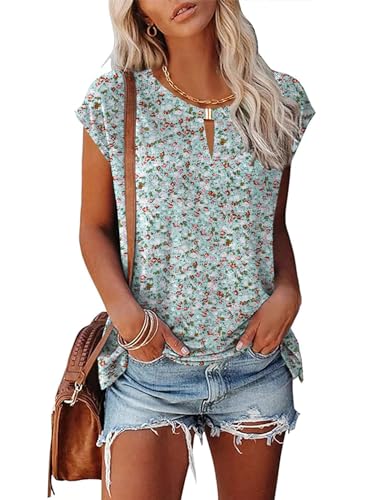 Kistore Womens Summer Casual Crew Neck Cap Sleeve Keyhole Ladies Tops Short Sleeve Floral Business Work Tunic Blouses T-Shirts Green White Floral Large