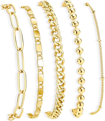 Poxtex Gold Bracelets for Women Trendy, 5pcs Dainty Stackable Bracelets for Women Waterproof, 14k Real Gold Bracelets Stack With Beaded Cuban Paperclip Satellite Mirror Chain, Gold Jewelry Set Gifts