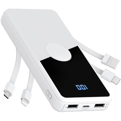 TXQX Portable Charger with Built in Cables,High Speed Power Bank 10000mAh Travel Battery Pack 5 Outputs 3 Inputs Portable Phone Charger Backup Battery for iPhone, Samsung, iPad,Tablets (White)