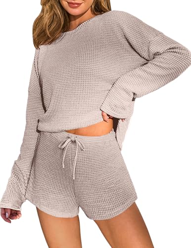 Unique Design: Women waffle pajamas with round neck, long sleeves and shorts combination is suitable for all seasons. The elastic drawstring at the waist makes wearing easier and more comfortable.The pockets can hold small items