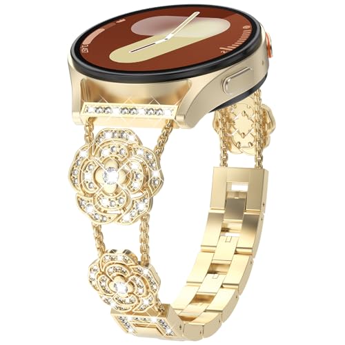 WINGLE Bling Band for Samsung Galaxy Watch 7 6 5 4 FE Band 40mm 44mm Women Watch 5 Pro 45mm, Camellia Rose Flower 20mm Metal Bands for Active 2/Watch 6/4 Classic 43mm 47mm 42mm 46mm/3 41mm Gold