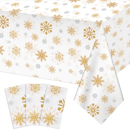 Package Included: You will receive 3 pcs Christmas plastic tablecloths printed with gold and silver snowflake patterns on white backdrop, which sends out a strong festive vibe, decorating for Christmas or winter celebrations