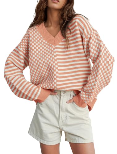 【Features】: long sleeve, V neck sweater, striped pattern, slight color block design at the sleeves and bottom, features a drop shoulder cut that creating a loose and casual effect. patchwork pullover sweaters, loose style with a chic look.