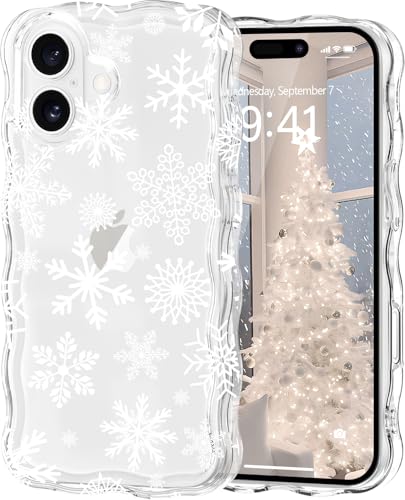 L-FADNUT Christmas Phone Case for iPhone 16 Cute Curly Wavy Merry Christmas Pattern Case Clear Aesthetic Santa Snowman Elk Cover for Girls Kids Women Slim TPU Protective Cover for iPhone 16,Snowflake