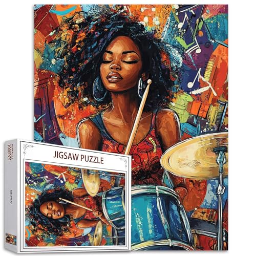 Rock Music Girl 1000 Piece Jigsaw Puzzles for Adults Black Woman Musican Painting Jigsaw Puzzle Africa Female 1000 Pieces Puzzles Game Girl Playing Musical Equipment Wall Decor DIY Craft Puzzle Art