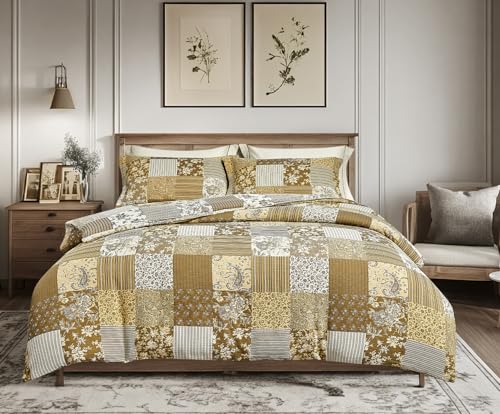 SLEEPBELLA Washed Double Layer Muslin 100% Cotton Comforter Set King Size, Boho Yellow Patchwork Fluffy Thick Checked Bedding Set, Soft Breathable (1 Comforter, 2 Pillow Shams)