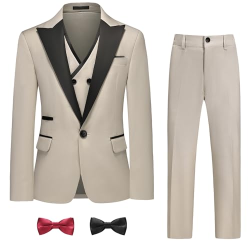 4 Piece Boys Suit Set: Boy's formal outfits include a satin collar blazer jacket,a double-breasted vest,a pair of pants with elastic waistband,and two bow ties:black and red.The pants are loose-fitting and suitable for children's activities;and two color bow ties can be changed flexibly according to different occasions,adding fun to the dress code.