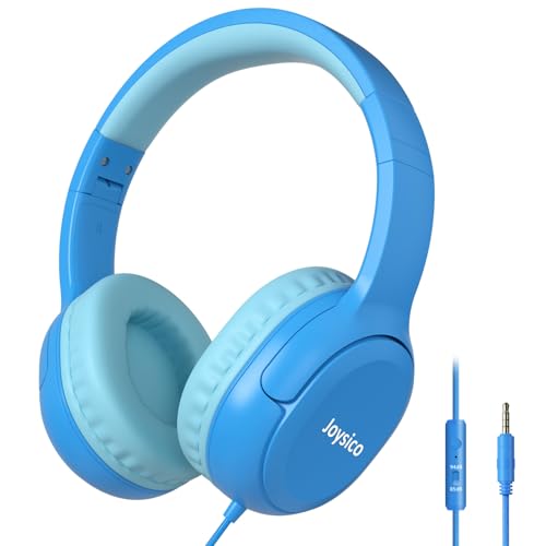 Joysico Kids Headphones with Cord & Mic for School Class Airplane Travel, 85/94dB Volume Limit Over Ear Earphones for Boys Girls Teens, Wired Foldable Headset for iPad Tablet Kindle Laptop PC Blue