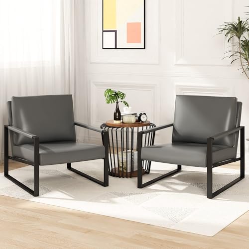 AWQM Leather Accent Chair Set of 2 Sofa Chair Extra-Thick Padded Backrest Seat Cushion Single Sofa Bedroom, Black Metal Frame, 105 Degree Slant Back-Grey(Set of 2)