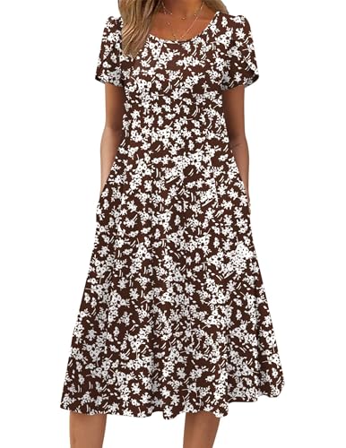 Zeagoo Womens Cotton Dress for Summer Womens Short Sleeve Midi Dress Brown Floral Fall Dresses Casual Sundress, Brown Floral L