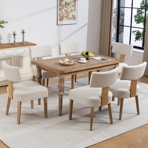 ZJhome Dining Chairs, Fabric Upholstered Wood Kitchen Chairs Set of 6, Linen Curved Backrest Accent Chairs,Farmhouse Modern Dining Chairs with Foot Pad for Kitchen/Living Room/Restaurant/Cafe-Beige